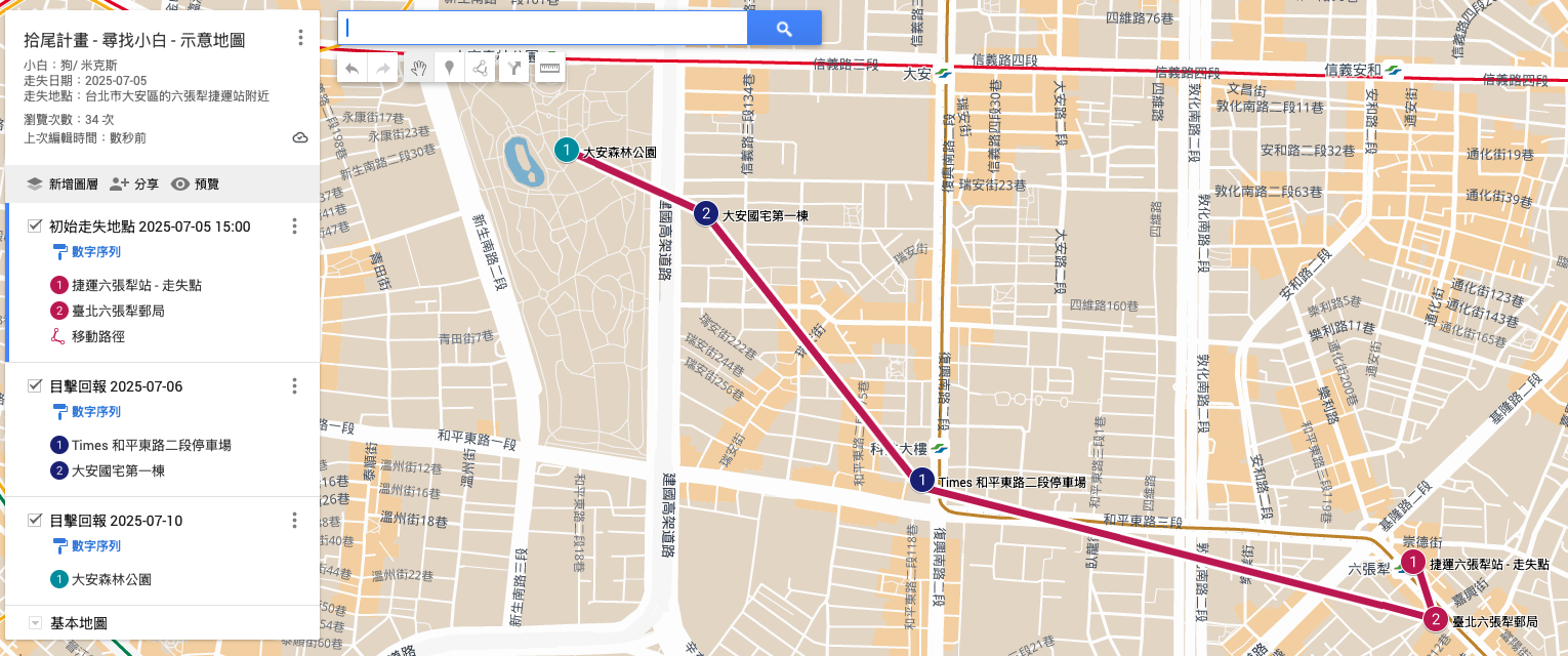 當毛孩不慎走失時,除了張貼尋狗/尋貓啟事,也可以用 Google My Maps 標記目擊地點與行動範圍,讓大家更快掌握情況。